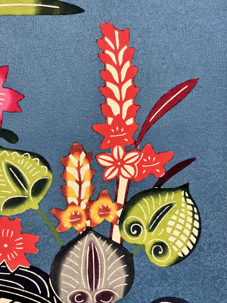 私自身の制作で特に印象に残っているのは、「波の歌」という紅型着物の作品です。これは沖縄の海を泳ぐ生き物たちの姿を、藍型を基調とした布に躍動感をもって表現したものです。伝統の技法を守りつつ、そこに自分なりの視点や工夫を重ねることで、新しい紅型の可能性を切り拓きたいという思いが込められています。こうした活動を通して、紅型が沖縄の誇る伝統工芸であるだけでなく、日本、そして世界に発信できるアートであると感じています。