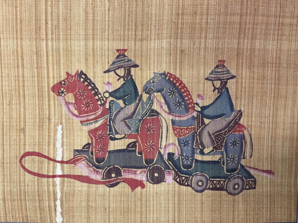 ある日、アメリカ兵たちが使い古して捨てていったテーブルクロスを見つける。泥や油で汚れていても、広げれば、どこかに白い部分が残っている。それを丁寧に切り取り、タペストリーとして染め始めた。次に必要なのは色である。しかし、岩絵具のような顔料はどこにもない。